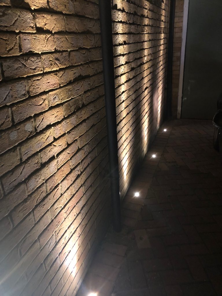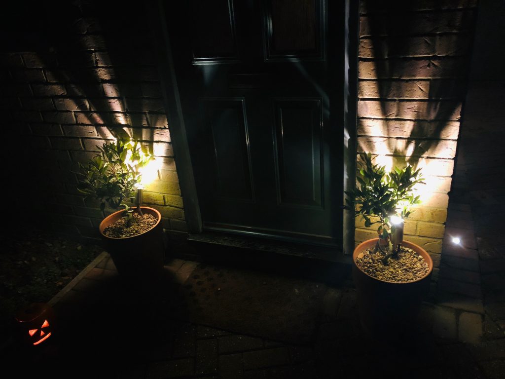 A little domestic electrical job we carried out recently, using 1watt spot lights in the drive way bricks and pot lighting by the front door.